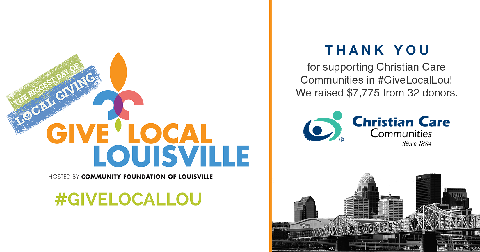 Thank you to everyone who designated a gift to Christian Care Communities in Give Local Louisville. We raised $7,775 from 32 donors. The success of Give Local Louisville helped raised over 4 Million Dollars for 600+ organizations. What an awesome day! Thank you to the Community Foundation of Louisville and the generous donors who sponsored this effort.